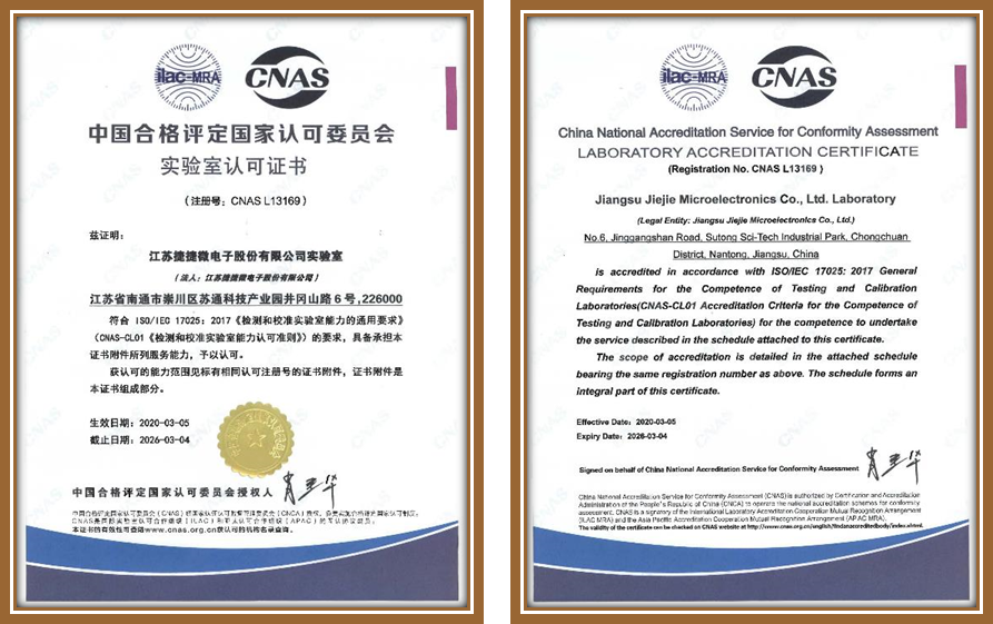 江蘇捷捷微電子股份有限公司實驗室測試中心,提供多種可靠性試驗,包括環(huán)境可靠性測試、板級可靠性試驗,使用壽命可靠性測試和全方位的失效分析服務。 捷捷微電子股份有限公司實驗室已經(jīng)獲得中國合格評定國家認可委員會的實驗室認可證書(CNAS認證) 江蘇捷捷微電子股份有限公司實驗室測試中心成立于 2011 年,分南通、啟東、深圳3個測試場地?,F(xiàn)有工作人員50名,其中管理人員 5 名,檢測人員 45名,簽字授權人4名,中級職稱人員2名,助理職稱人員6名,本科學歷人員21名。實驗室占地面積2000平方米,南通1200平方米,啟東800平方米。2018年8月發(fā)布并實施實驗室管理體系,并在2020年3月取得CNAS實驗室認可證書(L13169)。實驗室現(xiàn)有各類設備近170臺,可開展可靠性試驗項目20余項,浪涌過電壓檢測項目10余項,失效分析10余項以及特性測試等項目。與中科院微電子所、西電、中車等單位存在長期合作關系。