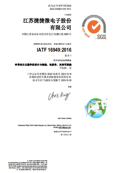 IATF 16949:2016 自2016年起開始參與汽車 16949 認證。我們的 IATF 16949 認證的范圍是“半導體分立器件的設計與制造,包括單、雙向可控硅”。參與認證的制造工廠的認證證書如下