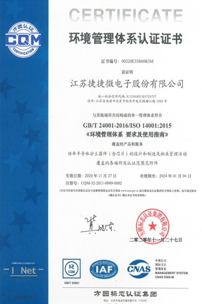 ISO 14001 江蘇捷捷微電子股份有限公司已取得 ISO 14001:2015 標準要求的企業(yè)認證,包括以下工廠已通過獨立認證)