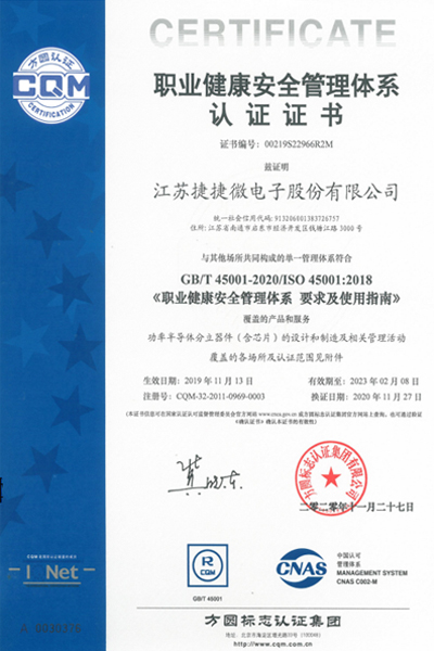ISO 45001 江蘇捷捷微電子股份有限公已取得 ISO 45001:2018 標準要求的企業(yè)認證,包括以下工廠(已通過獨立認證)