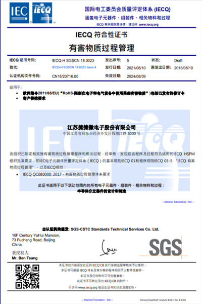 QC080000 江蘇捷捷微電子股份有限公已取得QC080000有害物質過程管理的企業(yè)認證,包括以下工廠(已通過獨立認證)
