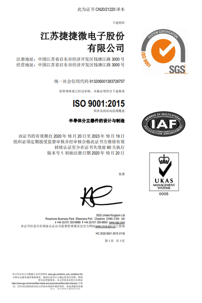 ISO 9001:2015 江蘇捷捷微電子自 2000年起建立了ISO 9001 質量管理體系。